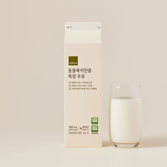 제품명 : 올가 동물복지 목장우유, 내용량 : 900ml, 원재료명 : 무항생제 원유 100%(국산/동물복지인증)